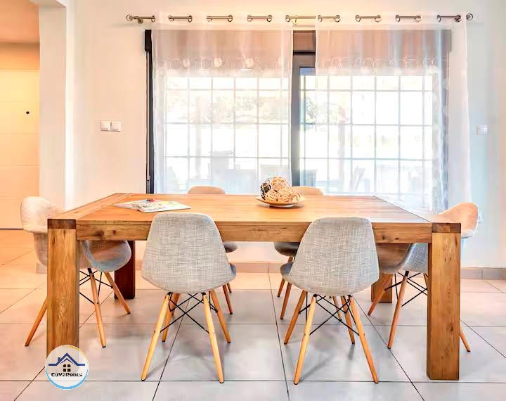 La casa cuenta con Wi-Fi gratuito en todas las áreas, cocina totalmente equipada, salón con TV, blu-ray, equipo de sonido con bluetooth, y caja fuerte en la habitación principal. Se incluye también un teléfono móvil nacional con saldo y contacto directo con el encargado para cualquier necesidad. Para familias con niños pequeños, se ofrece cuna, bañera, trona, vajilla infantil y silla homologada para coche.