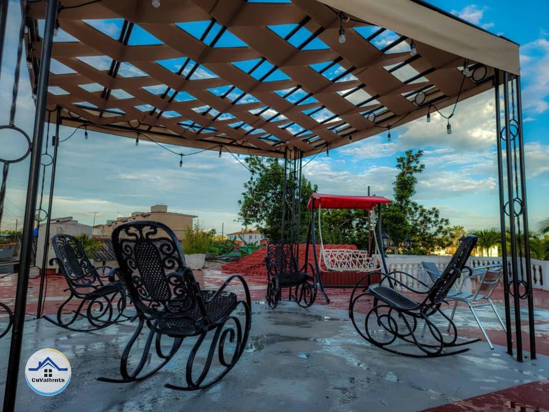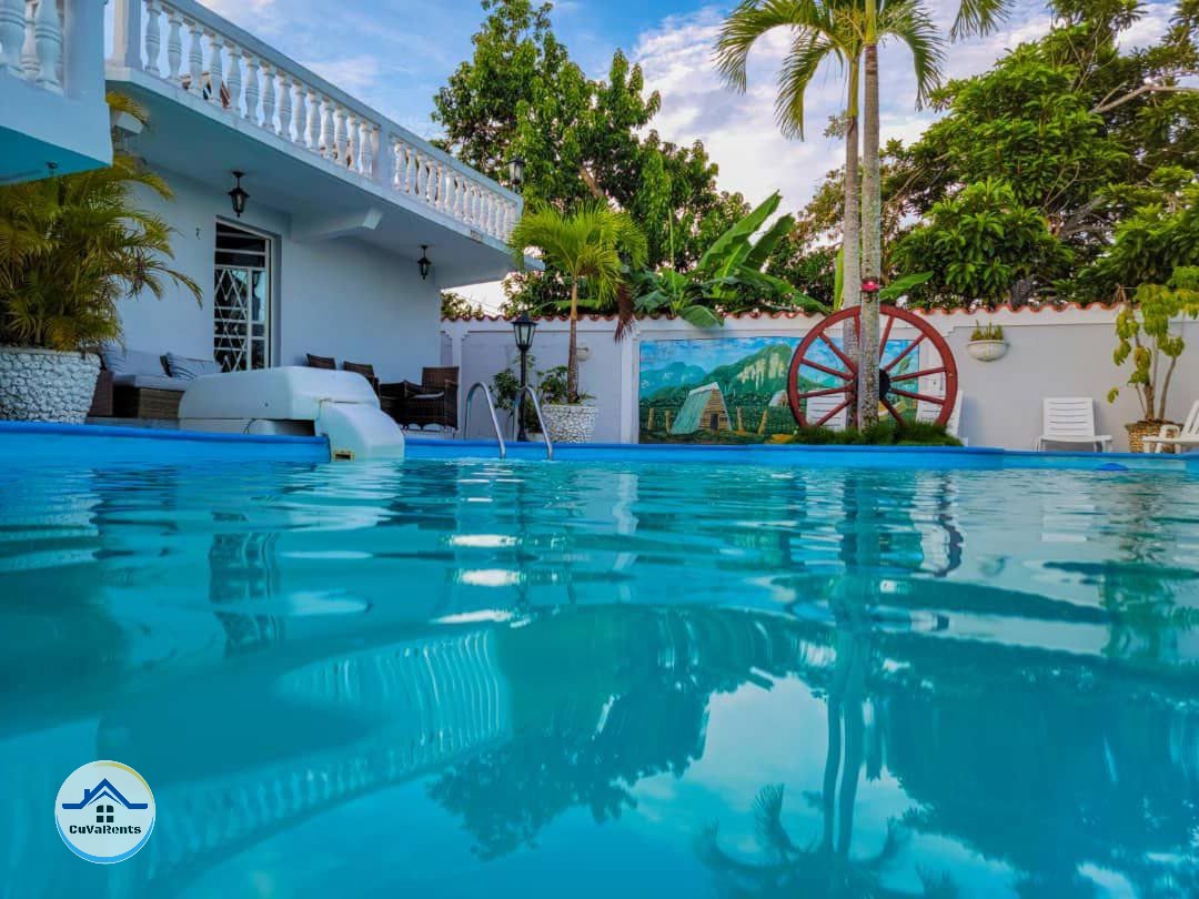 Alquiler de encantadora casa en el paisaje rural de Viñales, Pinar del Río, Cuba, ideal para grupos y familias que buscan confort junto a la naturaleza. La propiedad dispone de diez habitaciones climatizadas, piscina, conexión Wi-Fi y estacionamiento privado, además de un ranchón para eventos y área de bar. Para el entretenimiento, ofrece juegos de mesa y, a solicitud, servicio de comida (con cargo adicional). También ponemos a tu disposición transporte por un costo extra.