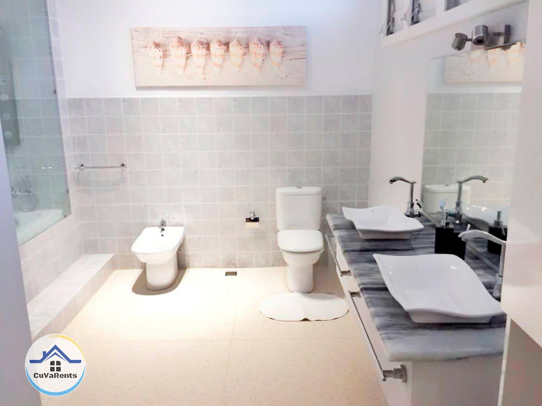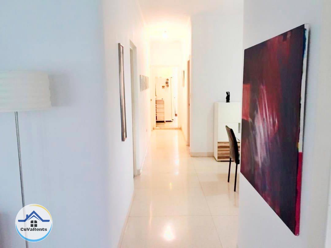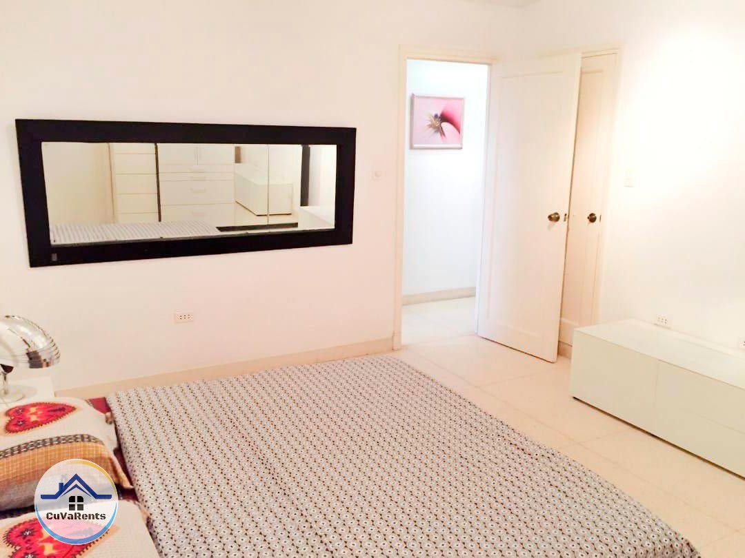 Alquiler de Apartamento con tres habitaciones climatizadas con su baño; sala espaciosa, bar, comedor y cocina completamente equipada con todos los utensilios necesarios.