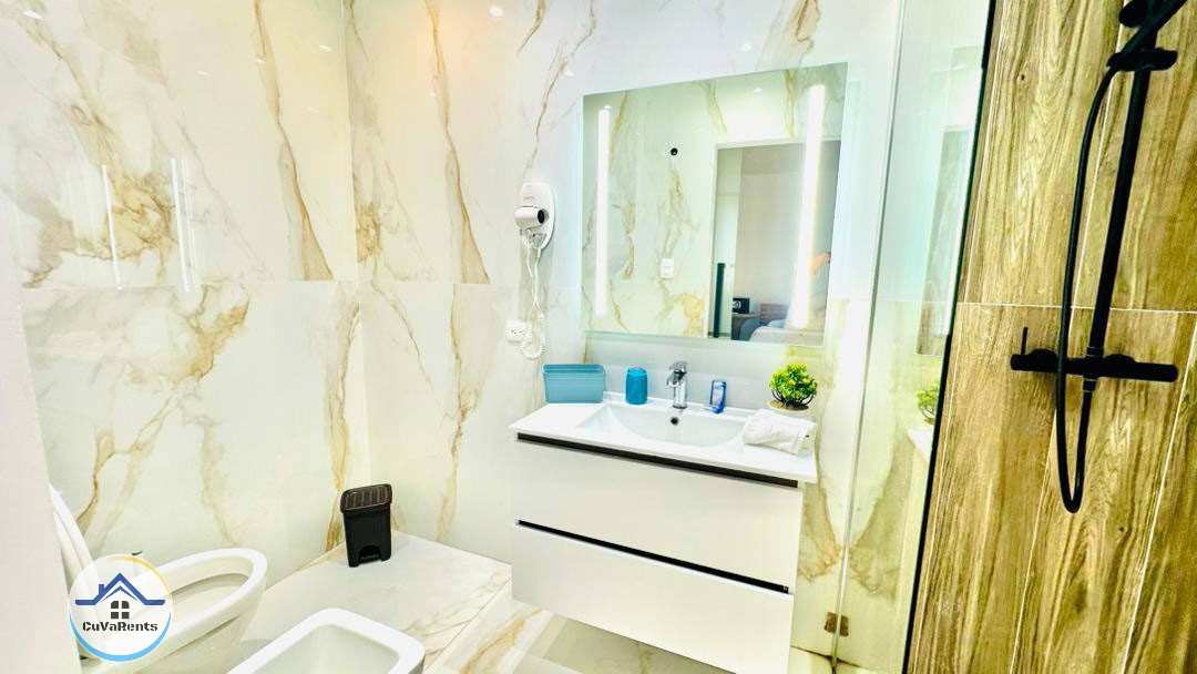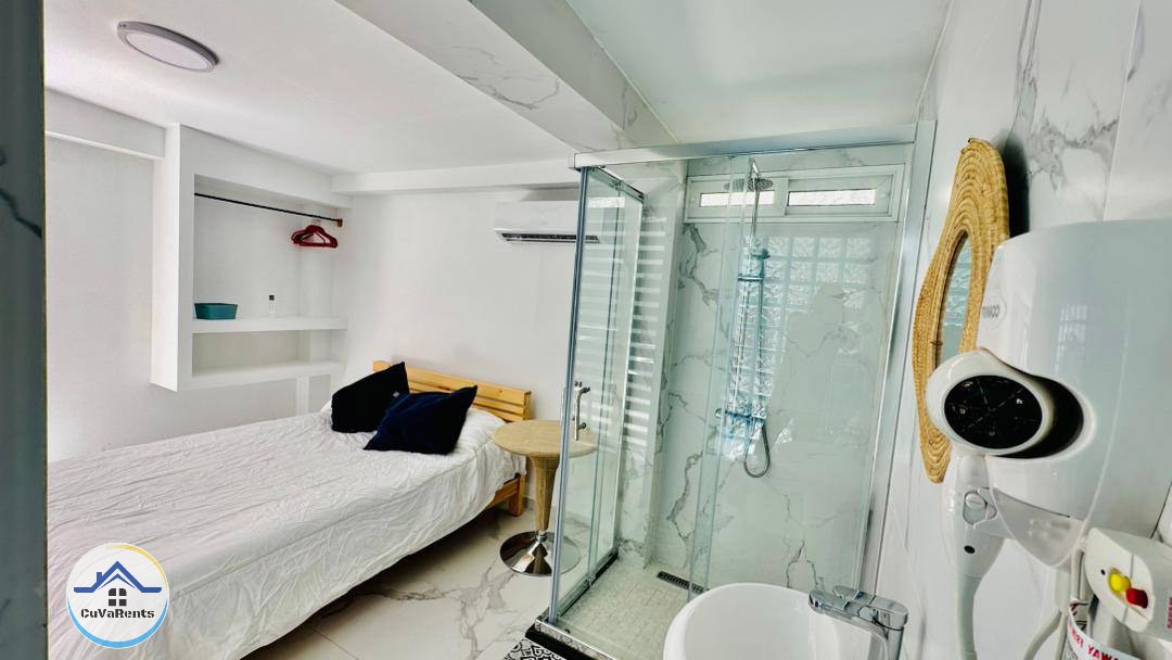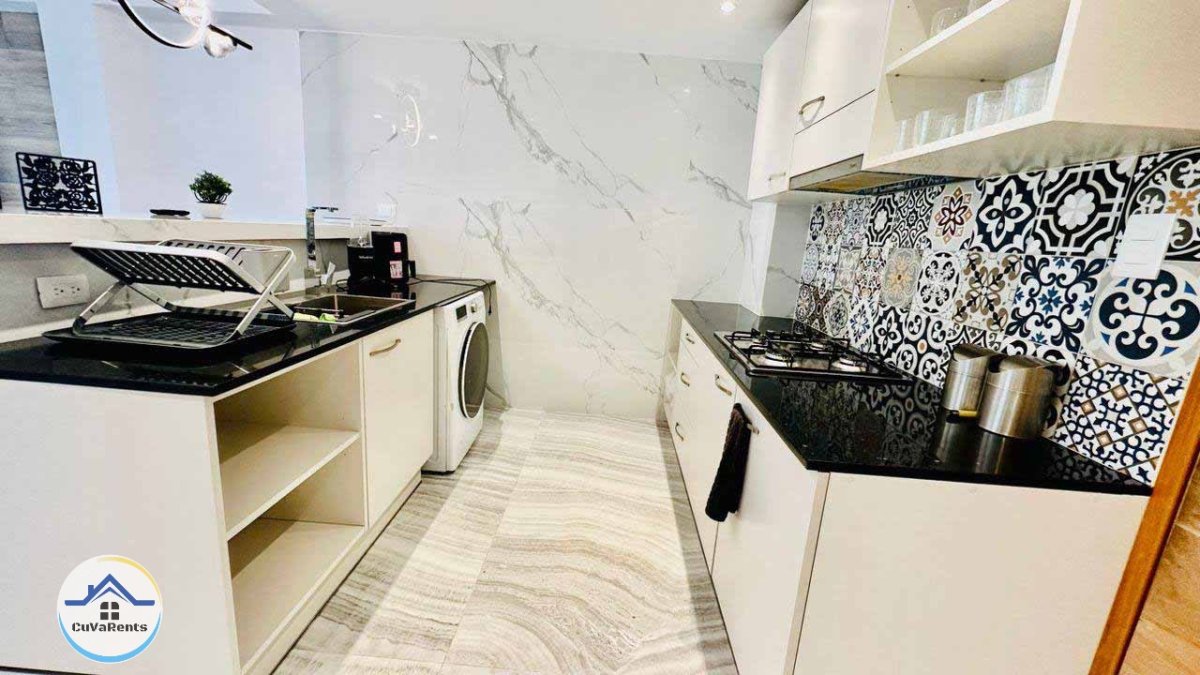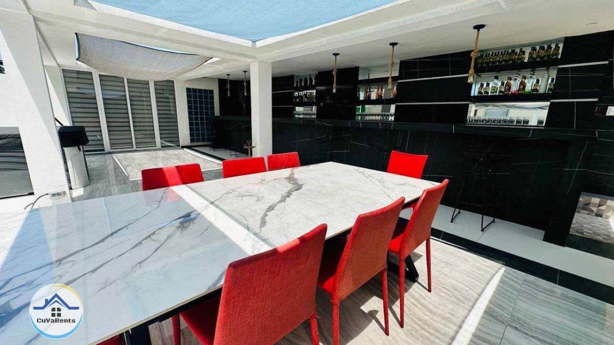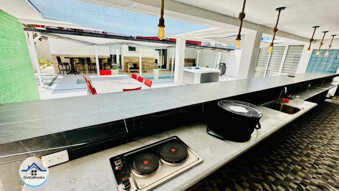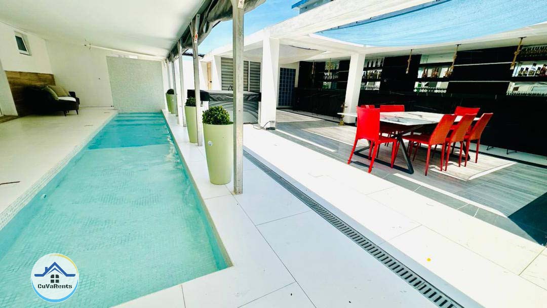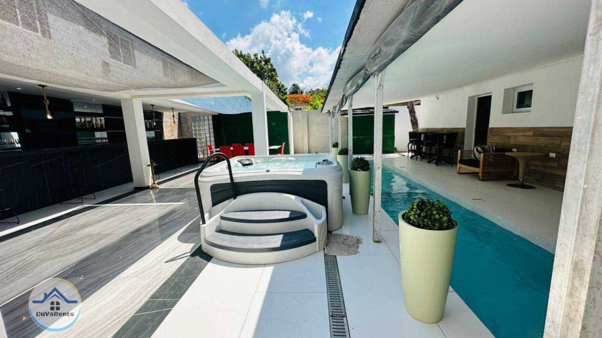 Se alquila una exclusiva casa de tres habitaciones, cada una con aire acondicionado y baño privado. La propiedad cuenta con una amplia terraza que incluye piscina. La cocina está completamente equipada y se dispone de planta eléctrica.