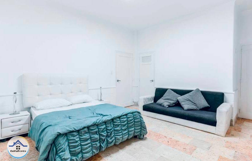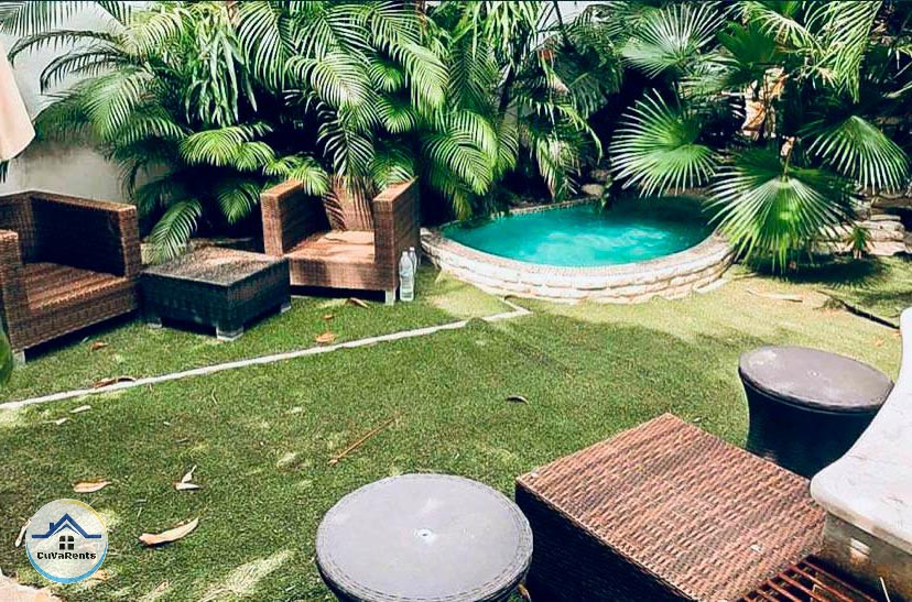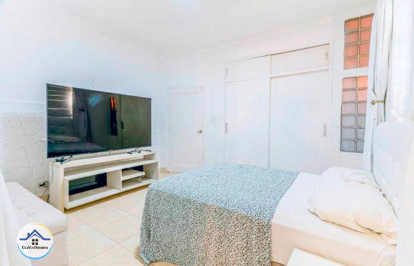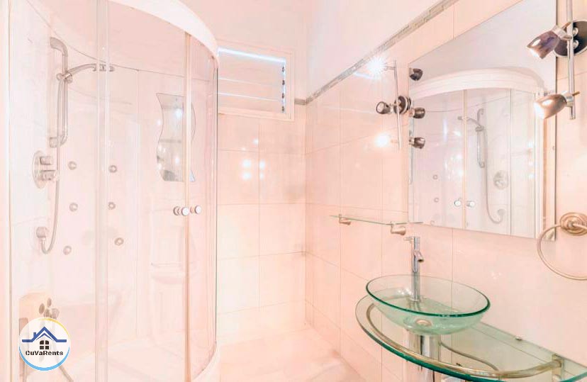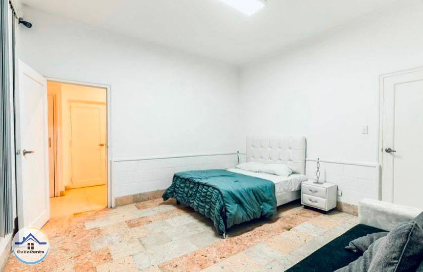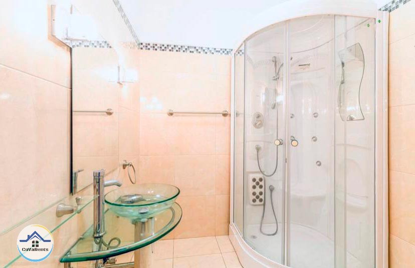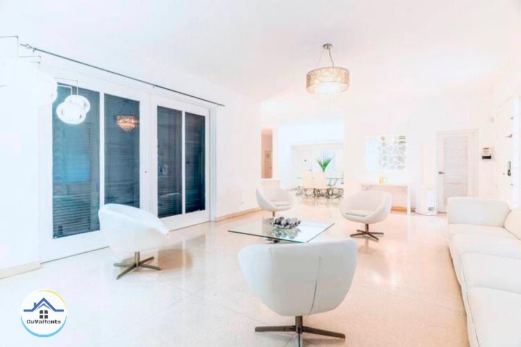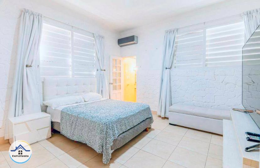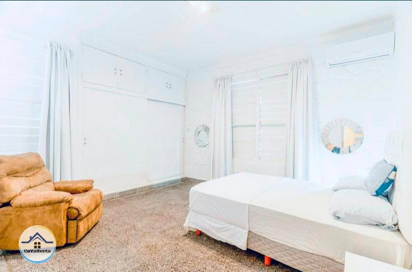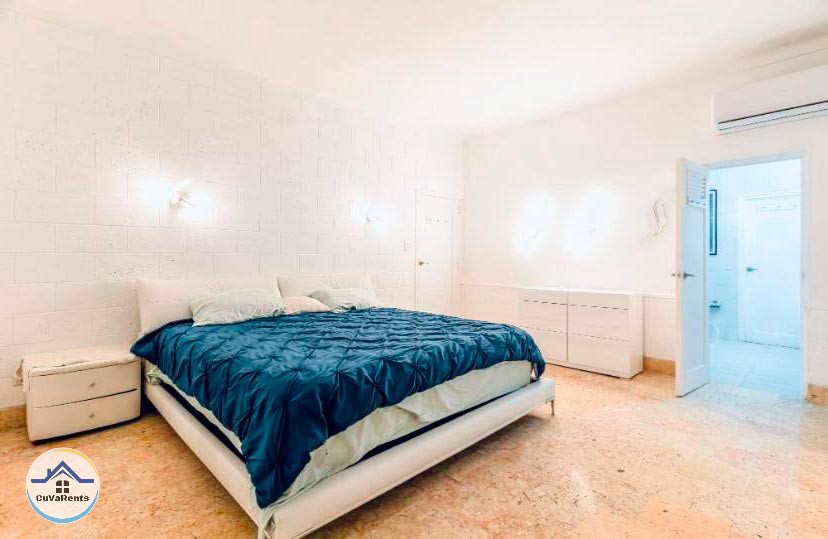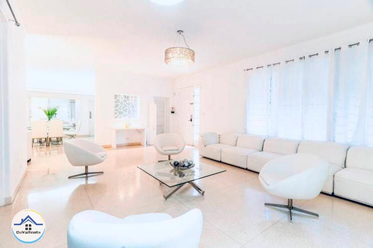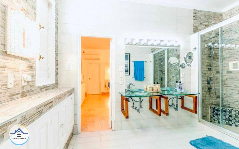 Villa residencial de diseño moderno con piscina pequeña, ubicada en Miramar; compuesta por cuatro habitaciones espaciosas con aire acondicionado y baños privados con agua caliente y fría. La casa tiene 5 baños en total y un gimnasio con sauna, caja fuerte, TV, teléfono, cocina, refrigerador, servicio de lavandería, desayuno, almuerzo y cena bajo petición. Estacionamiento para automóviles, 2 garajes y protección las 24 horas.