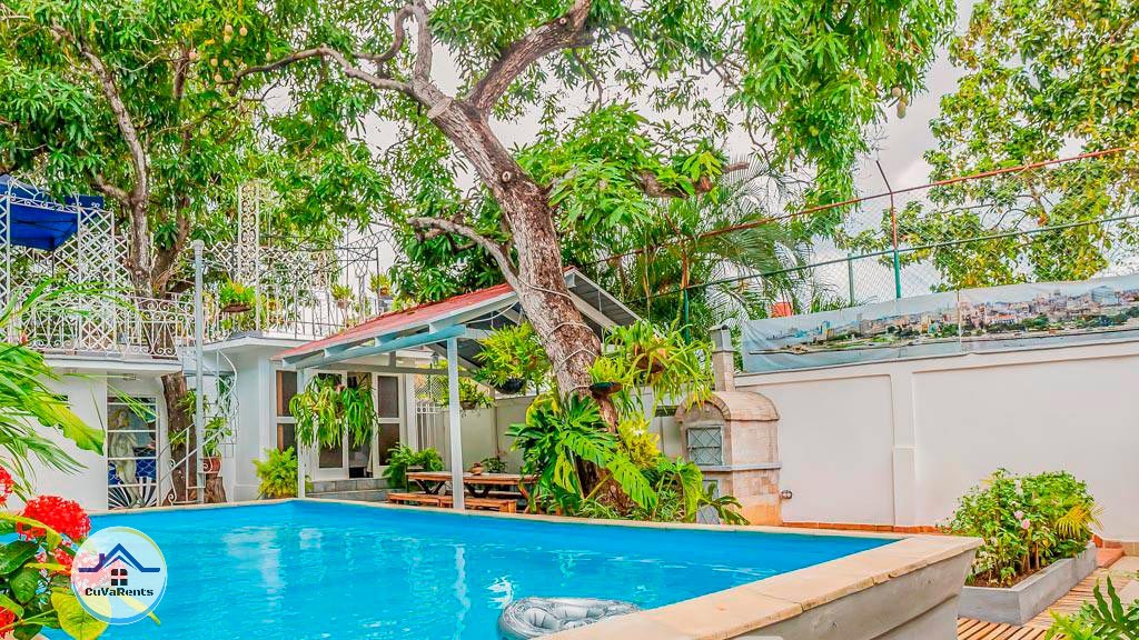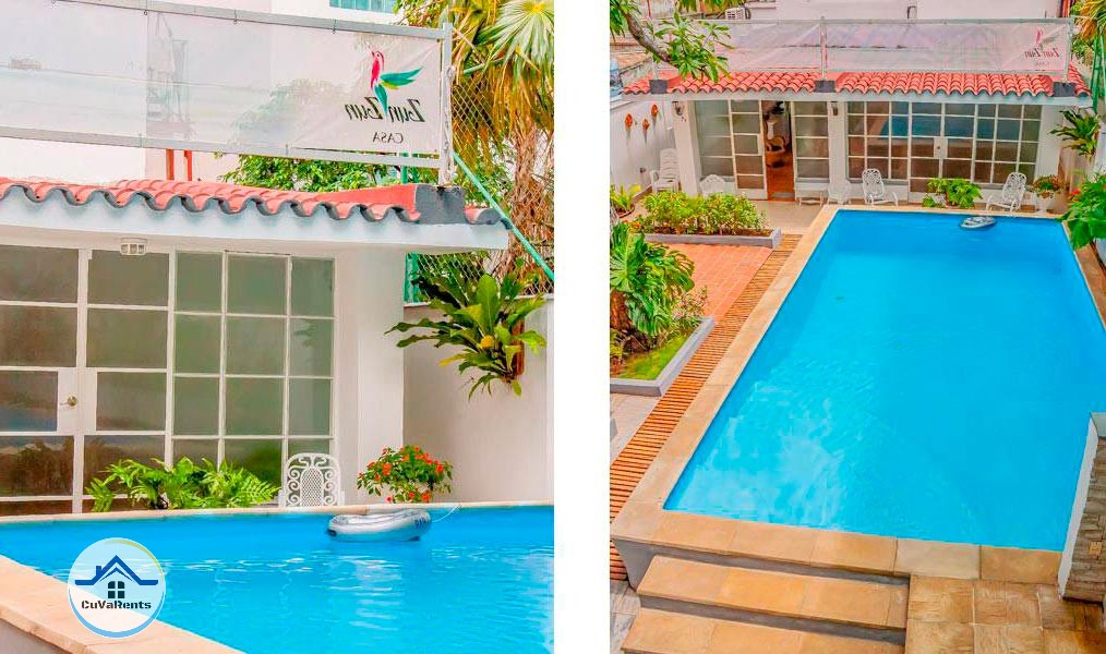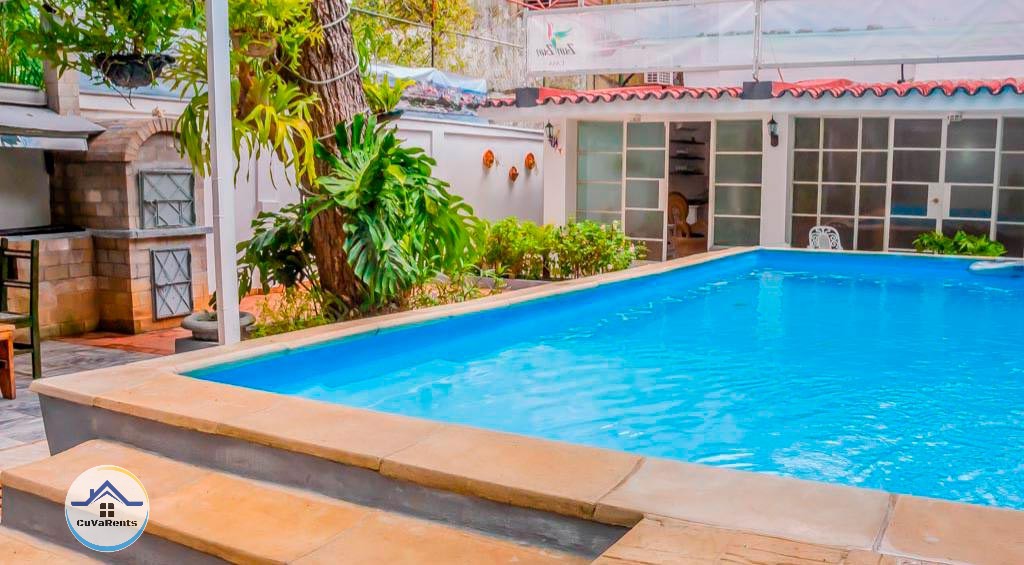 Renta de casa con piscina de cuatro habitaciones con aire acondicionado y máximo confort. La propiedad cuenta con una amplia terraza, cocina equipada con todos los aditamentos y Wi-FI; se ofrece servicio de desayuno y comida por un precio adicional.