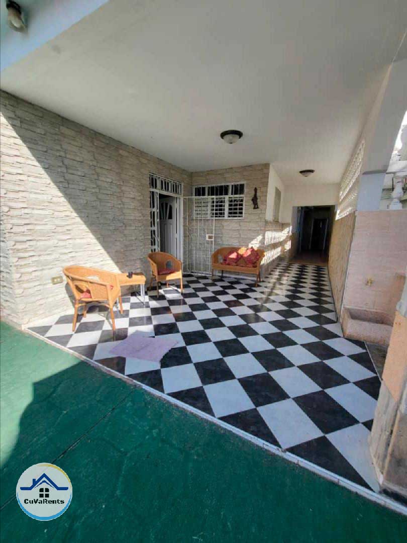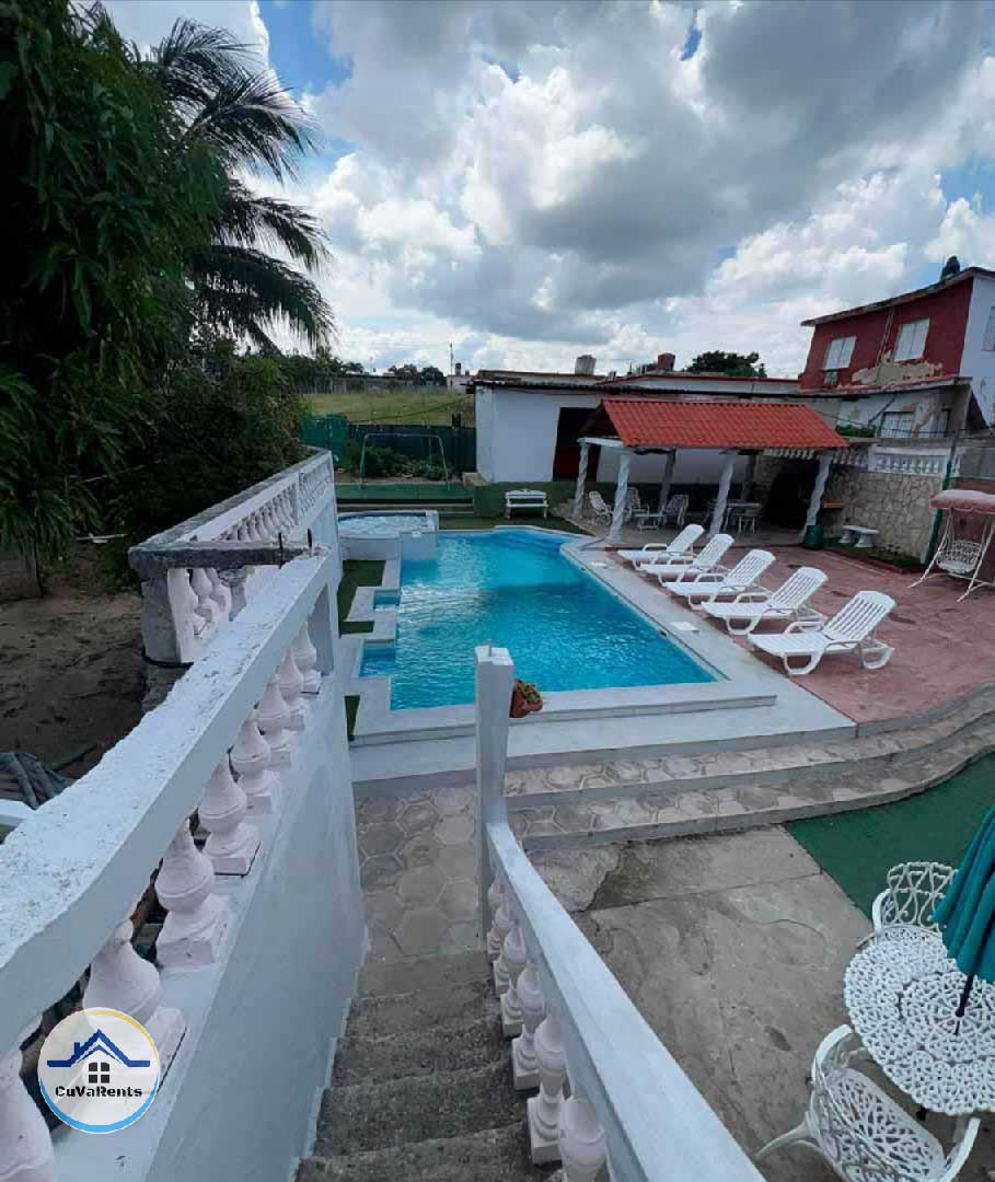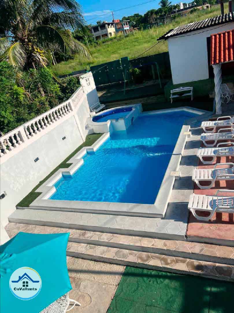 Renta de casa en la playa de Guanabo, La Habana, Cuba, ubicada a solo 50 metros del mar y cerca de la rotonda y el parque principal; la propiedad ofrece amplio garaje para 8–10 autos, piscina con área para jugar dominó, horno de carbón, parquecito infantil, 3 habitaciones, 2 baños, sala, comedor, cocina equipada con refrigerador y freezer, además de un apartamento adicional con sala-comedor, refrigerador extra, equipo de música, cámaras de seguridad y todas las condiciones ideales para familias grandes o grupos que buscan comodidad y excelente ubicación.